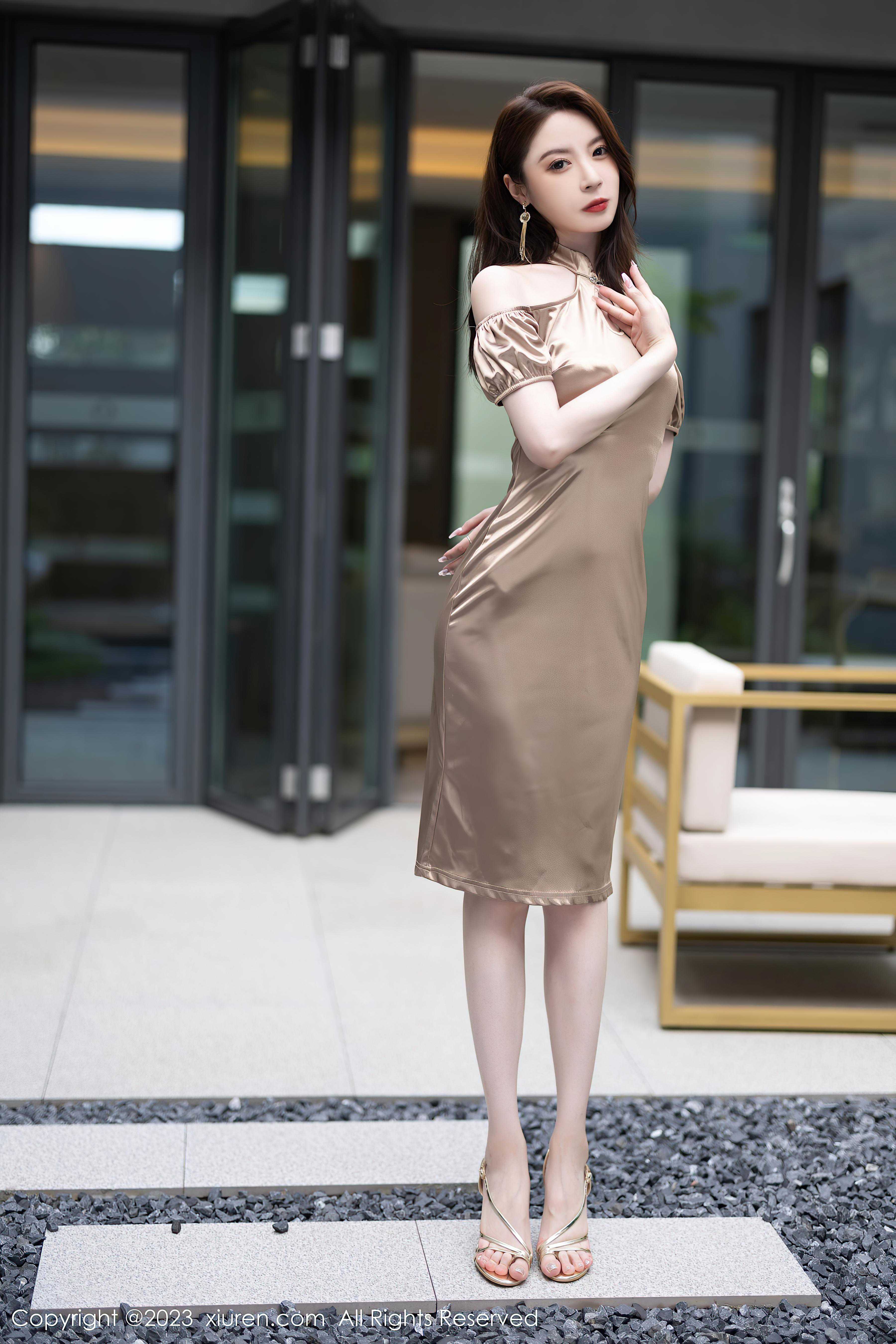 [XiuRen秀人网]2023.06.29 NO.6997 梦心玥 金色修身旗袍裙与黑色内衣加黑丝美腿性感私房写真集
